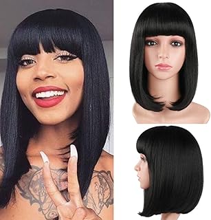 YMHPRIDE Perücken Kurze Bob Perücke für Frauen Yaki gerade synthetische Perücken flach Pony Perücke schwarz Farbe Sammler Perücken mit Perückenkappe