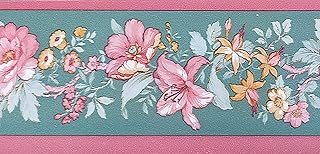 Dundee Deco BD6074 Tapeten Bordüre mit Blumenmuster, Tapetenbordüre Retro-Design, 4,57 m x 17,78 cm, Beige/Rosa/Grün